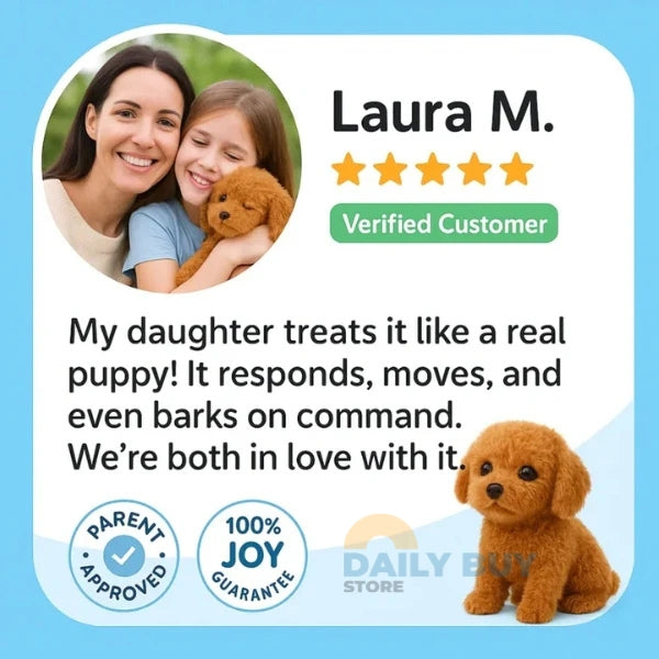 The puppy is an ultra-realistic plush toy that appeals to both adults and children! It behaves like a real companion dog. With over 30 years of experience in manufacturing pet plush toys, each of our creations is unique and realistic. VOTED AS THE BEST TECHNOLOGICAL INNOVATION OF 2024.